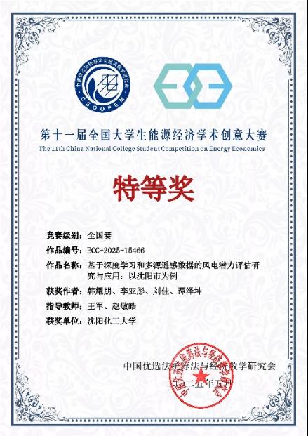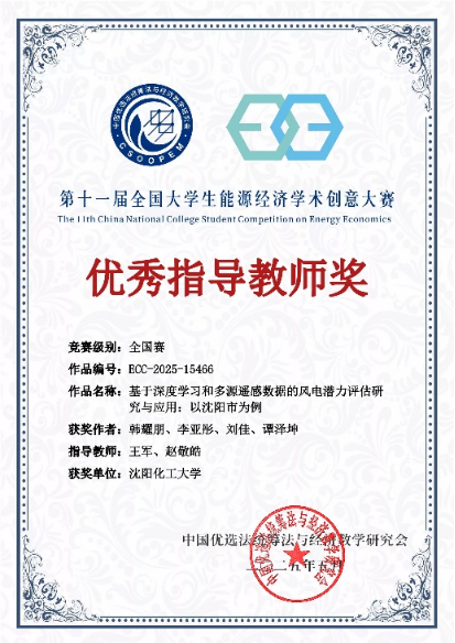 第十一届全国大学生能源经济学术创意大赛总决赛在5 月 24 日至 25 日举行。我校研究生韩耀鹏等学生的作品《基于深度学习和多源遥感数据的风电潜力评估研究与应用:以沈阳市为例》成功进入终审决赛,在激烈角逐中最终斩获全国研究生组特等奖。该作品由我校beat365手机版官网王军教授和中国科学院青岛生物能源与过程研究所田亚峻研究团队的赵敬皓工程师联合指导,是我校在该大赛中取得的历史最高奖项。